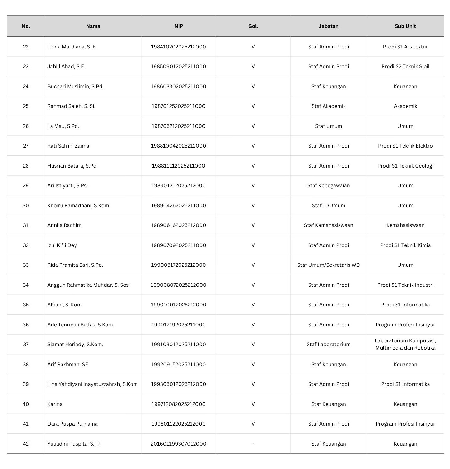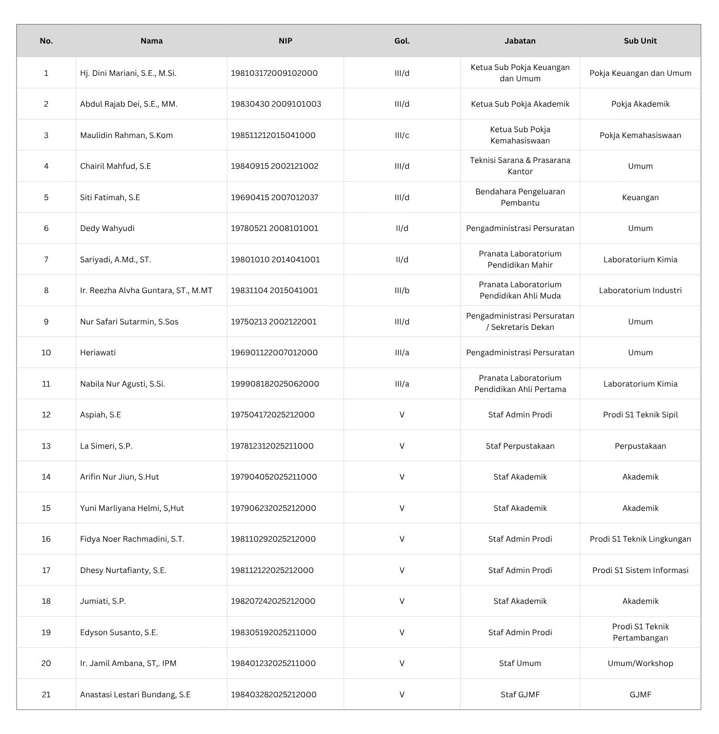 Berikut adalah daftar Tenaga Kependidikan yang ada di Fakultas Teknik: